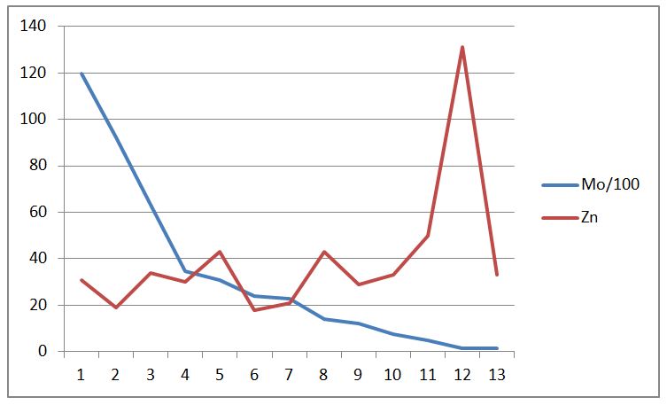 Figure 12: Zn and Mo/100 values (LHS in ppm)