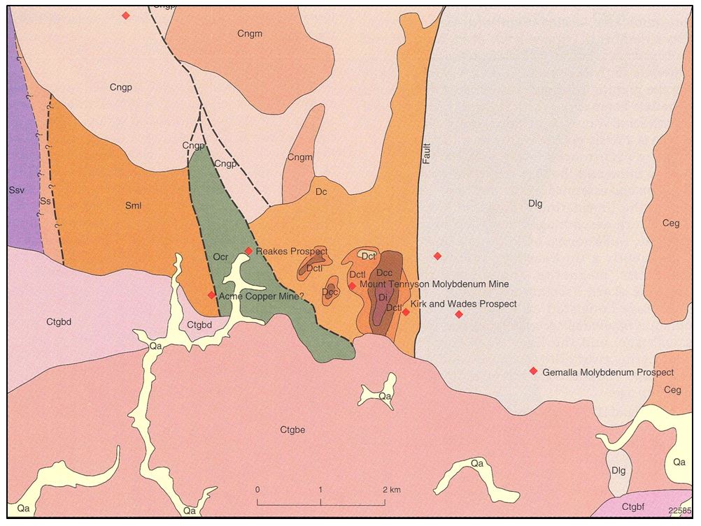 The Mt Tennyson Mo deposit is located on the southern slopes of Mt Tennyson and is hosted in a calc-silicate skarn belonging to the Turondale Formation of the Crudine Group. The Turondale Formation is a sequence of massive feldspathic to lithic sandstones, siltstones and conglomerates.