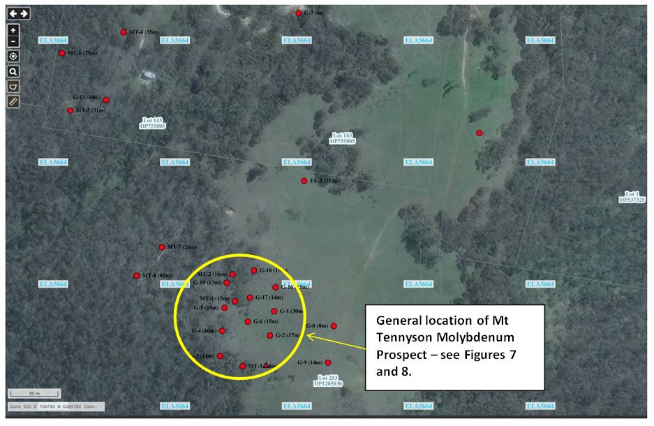 • Drilling results at the Mt Tennyson Molybdenite Prospect area from the 1960’s have demonstrated attractive Mo results which have never been followed up. Given the shallow nature of the Mo mineralisation in this area, an intensive RC drilling program, subject to preliminary geophysical and geological surveys, is recommended with the objective of confirming and expanding upon the resources already delineated and upgrading the results to JORC 2012 standard – see Figure 8.
