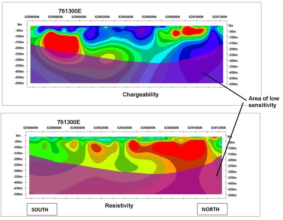 2011: An Induced Polarisation survey was conducted by Fender Geophysics in February-March 2011. This offset dipole survey was a follow up to a simple dipole-dipole survey that was carried out in March 2010 and provided greater resolution at depth as well as having a slight northerly extension to both the transmit and receive lines. The results of this survey are illustrated in Figures 6 and 7 and demonstrate the presence of at least two strong anomalies.
