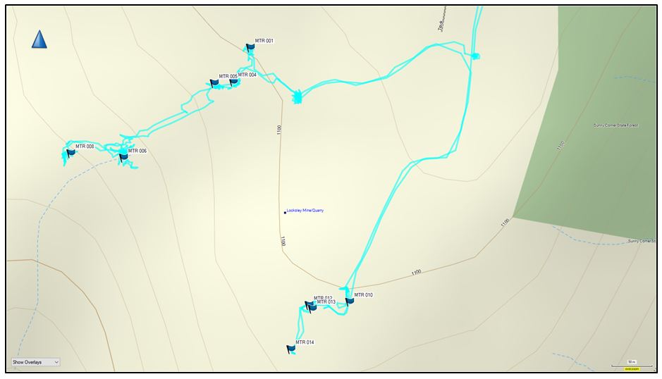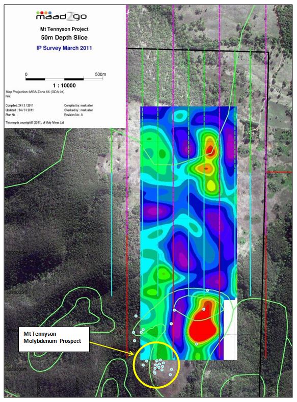 2010: Moly Ex conducted a dipole-dipole Induced Polarisation (IP) Survey at Mt Tennyson. Results from this survey were very encouraging and indicated two conductive zones; one in the north of the survey area adjacent to the Duronal Stock; and one at depth at the southern end of the survey area adjacent to the historic Mammoth Mine; however this survey has limited resolution at depths greater than 50 meters.
