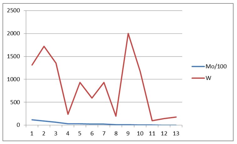 Figure 9: W and Mo/100 values (LHS in ppm)