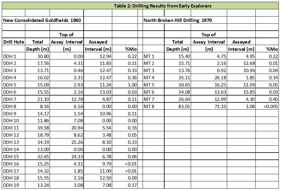 The location of drill holes completed by New Consolidated Gold Fields and North Broken Hill are illustrated in Figure 5 and summary assay results are depicted in Table 2. Values up to 1.00%Mo over 11 metres are recorded.