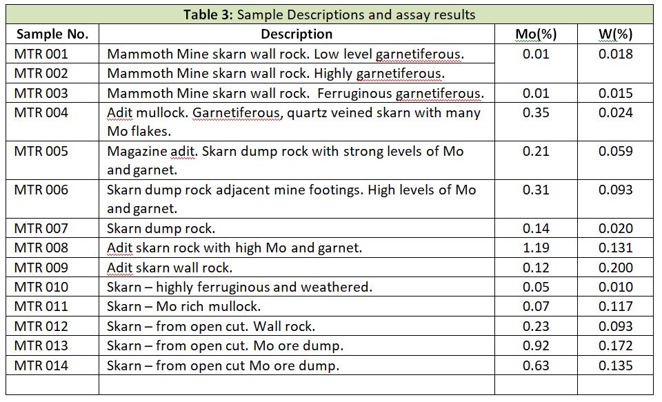 Results from the re-assaying of core in 2005 indicated comparable if not slightly higher Mo values as well as highly anomalous W values throughout all samples assayed.