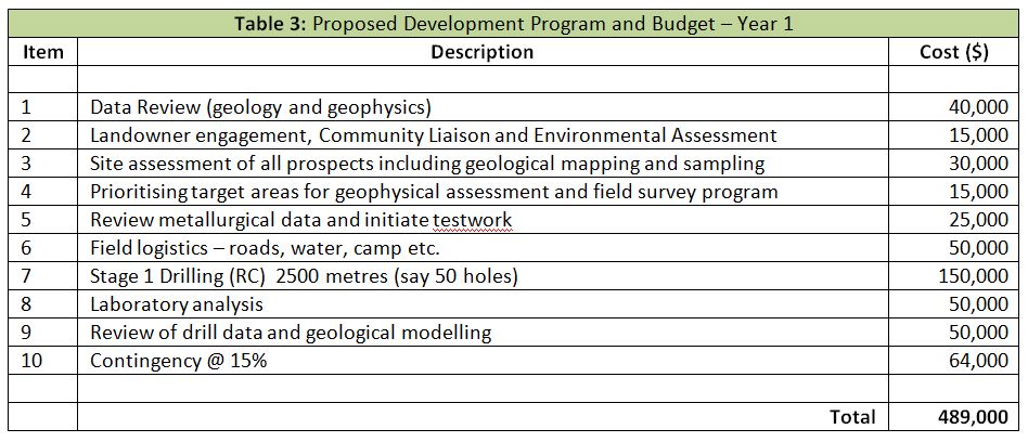 The budget for the proposed Year 1 (2019) exploration and development program is approximately $0.489 million and is detailed in Table 3.